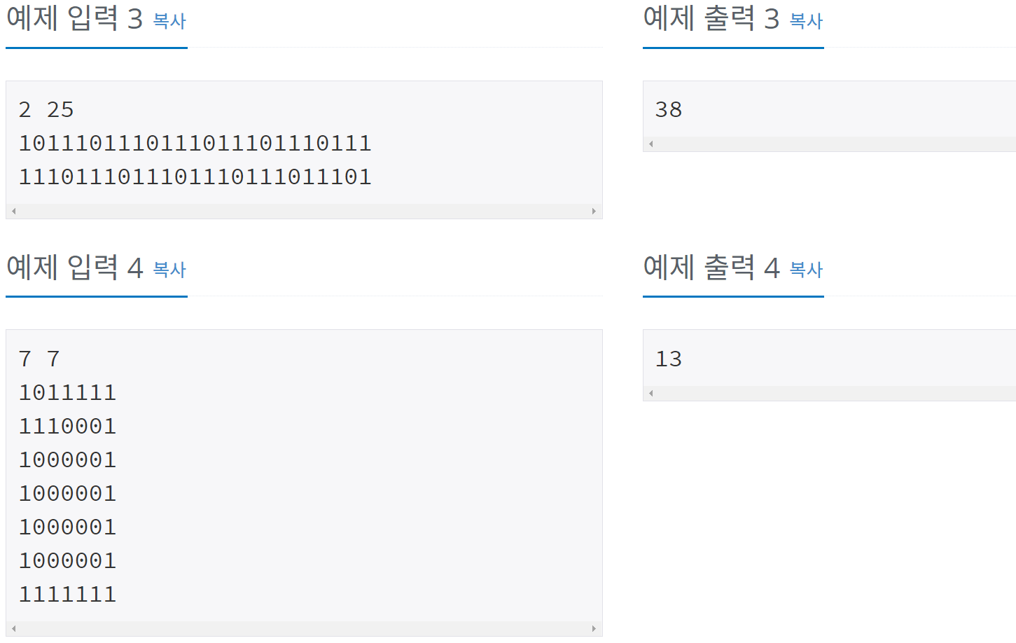 첫째 줄에 두 정수 N, M(2 ≤ N, M ≤ 100)이 주어진다. 다음 N개의 줄에는 M개의 정수로 미로가 주어진다. 각각의 수들은 붙어서 입력으로 주어진다.
