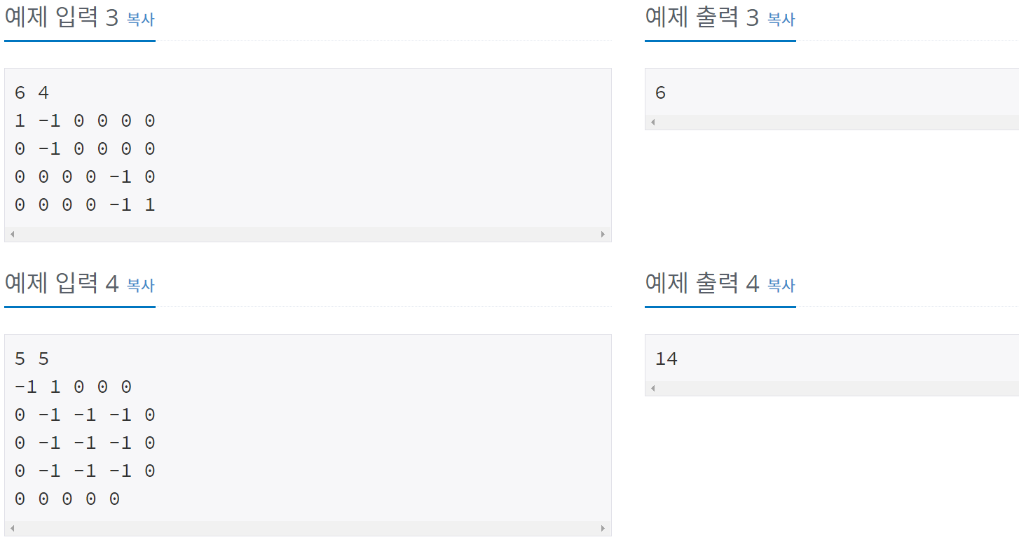 첫 줄에는 상자의 크기를 나타내는 두 정수 M,N이 주어진다. M은 상자의 가로 칸의 수, N은 상자의 세로 칸의 수를 나타낸다. 단, 2 ≤ M,N ≤ 1,000 이다. 둘째 줄부터는 하나의 상자에 저장된 토마토들의 정보가 주어진다. 즉, 둘째 줄부터 N개의 줄에는 상자에 담긴 토마토의 정보가 주어진다. 하나의 줄에는 상자 가로줄에 들어있는 토마토의 상태가 M개의 정수로 주어진다. 정수 1은 익은 토마토, 정수 0은 익지 않은 토마토, 정수 -1은 토마토가 들어있지 않은 칸을 나타낸다.