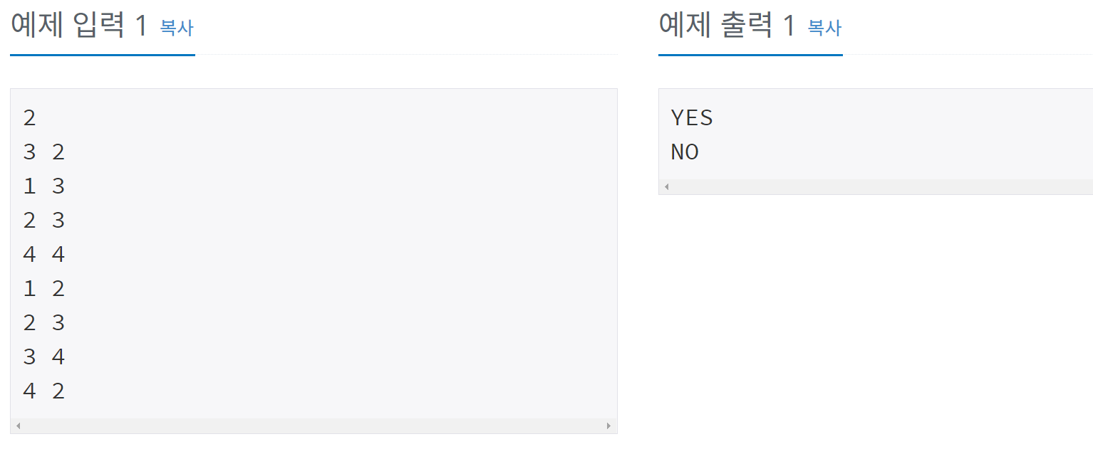 K개의 줄에 걸쳐 입력으로 주어진 그래프가 이분 그래프이면 YES, 아니면 NO를 순서대로 출력한다.
