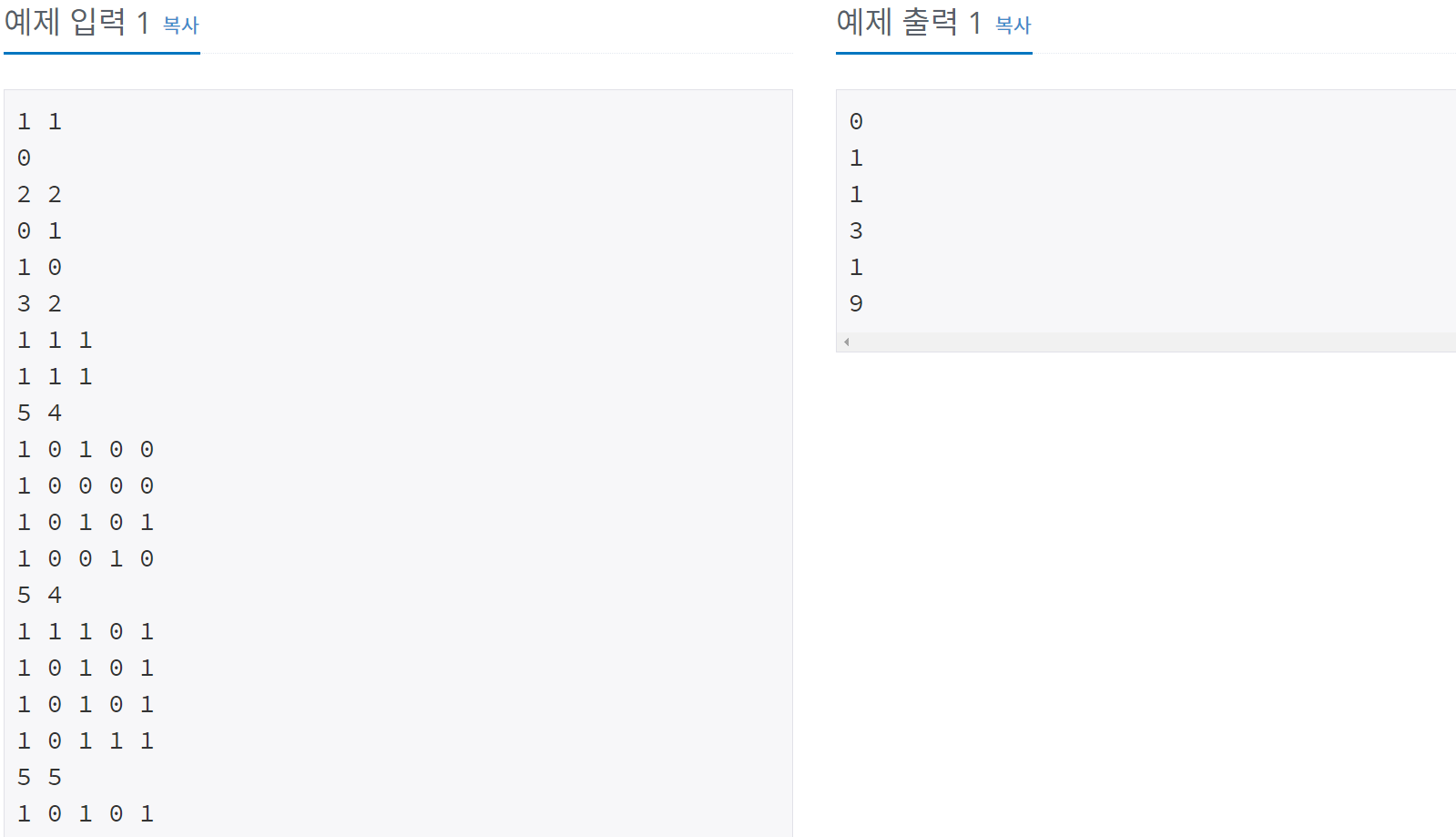 입력은 여러 개의 테스트 케이스로 이루어져 있다. 각 테스트 케이스의 첫째 줄에는 지도의 너비 w와 높이 h가 주어진다. w와 h는 50보다 작거나 같은 양의 정수이다.