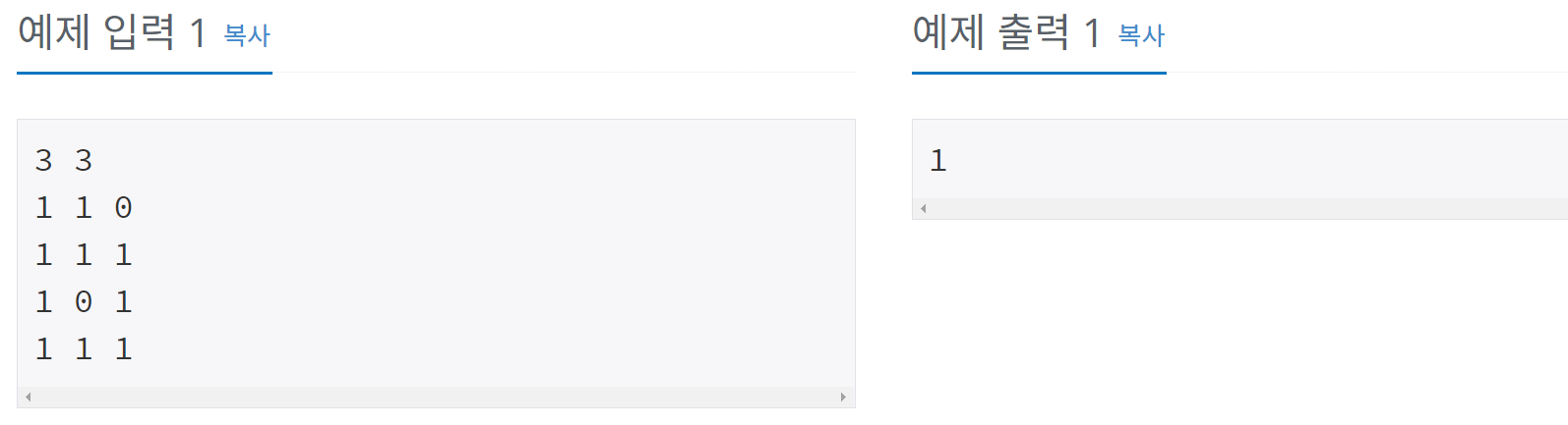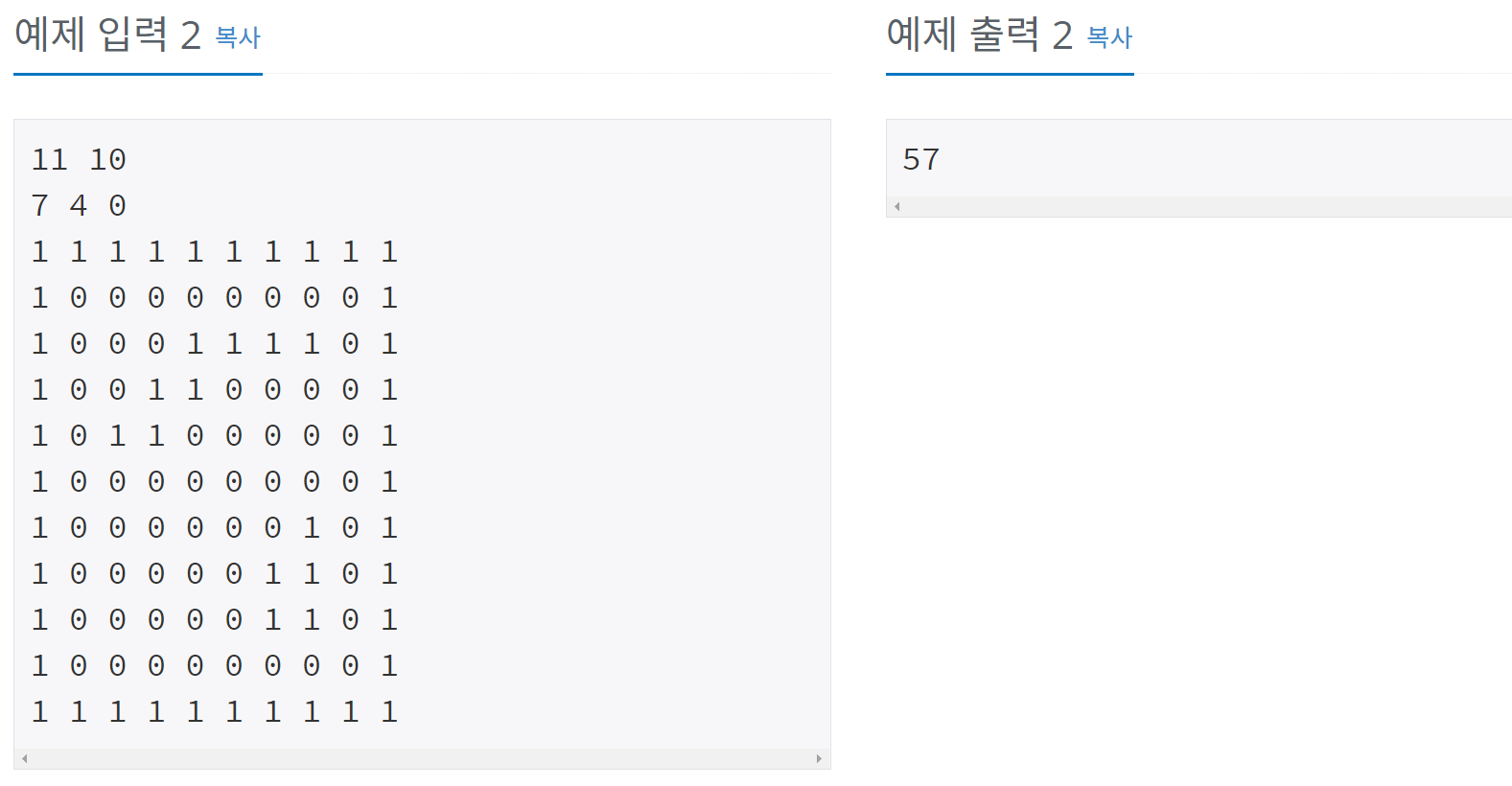 셋째 줄부터 N개의 줄에 장소의 상태가 북쪽부터 남쪽 순서대로, 각 줄은 서쪽부터 동쪽 순서대로 주어진다. 빈 칸은 0, 벽은 1로 주어진다. 지도의 첫 행, 마지막 행, 첫 열, 마지막 열에 있는 모든 칸은 벽이다.