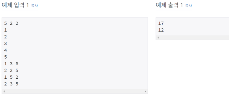 첫째 줄에 수의 개수 N(1 ≤ N ≤ 1,000,000)과 M(1 ≤ M ≤ 10,000), K(1 ≤ K ≤ 10,000) 가 주어진다. M은 수의 변경이 일어나는 횟수이고, K는 구간의 합을 구하는 횟수이다. 그리고 둘째 줄부터 N+1번째 줄까지 N개의 수가 주어진다. 그리고 N+2번째 줄부터 N+M+K+1번째 줄까지 세 개의 정수 a, b, c가 주어지는데, a가 1인 경우 b(1 ≤ b ≤ N)번째 수를 c로 바꾸고 a가 2인 경우에는 b(1 ≤ b ≤ N)번째 수부터 c(b ≤ c ≤ N)번째 수까지의 합을 구하여 출력하면 된다.