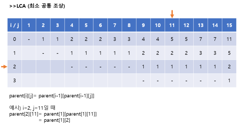 parent[i][j]= parent[i-1][parent[i-1][j]] 의 점화식이 성립합니다.