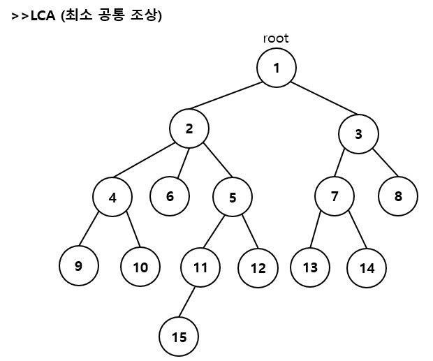 문제의 예제를 트리로 만들어 놓고 이 트리를 기준으로 LCA에 대해 설명을 하자면,