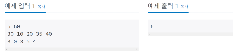 입력은 3줄로 이루어져 있다. 첫 줄에는 정수 N과 M이 공백문자로 구분되어 주어지며, 둘째 줄과 셋째 줄에는 각각 N개의 정수가 공백문자로 구분되어 주어진다. 둘째 줄의 N개의 정수는 현재 활성화 되어 있는 앱 A1, ..., AN이 사용 중인 메모리의 바이트 수인 m1, ..., mN을 의미하며, 셋째 줄의 정수는 각 앱을 비활성화 했을 경우의 비용 c1, ..., cN을 의미한다