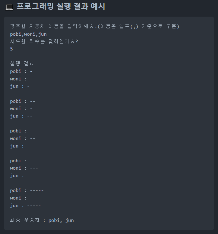 2주차 미션 내용 자동차들끼리 경주하여 최종 우승자를 출력하는 게임을 구현합니다. 1. 입력 [자동차] - 자동자이름을 쉼표로 구분하여 입력받습니다. - 자동차 이름은 5자 이하여야 합니다. [