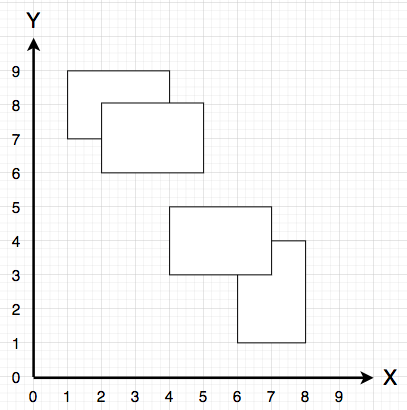 단, 서로 다른 두 직사각형의 x축 좌표 또는 y축 좌표가 같은 경우는 없습니다.