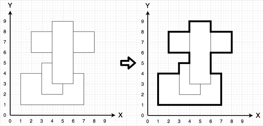 즉, 위 그림처럼 서로 다른 두 직사각형이 꼭짓점에서 만나거나, 변이 겹치는 경우 등은 없습니다.
