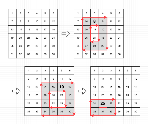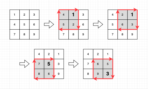 이 예시에서는 행렬의 테두리에 위치한 모든 칸들이 움직입니다. 따라서, 행렬의 테두리에 있는 수 중 가장 작은 숫자인 1이 바로 답이 됩니다.